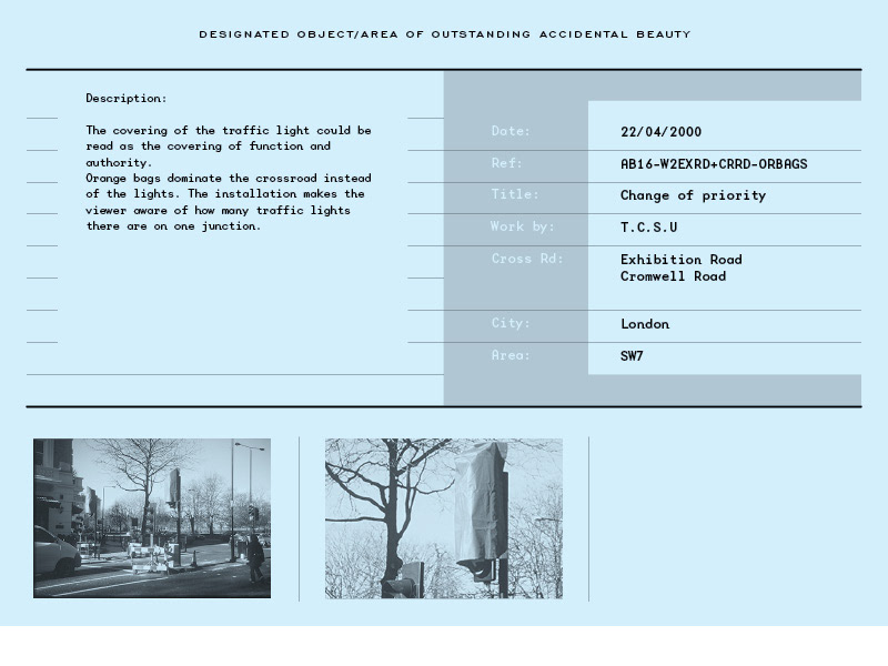 Together with fellow student Raky I shared the amazement of the transformation of a certain crossroad nearby the RCA in London. Due to maintenance work on the crossroad all the traffic lights had been covered with orange bags by T.C.S.U. (Traffic Control Systems Unit). In our opinion T.C.S.U. had transformed a normal junction into an art installation. Our aim was to share this view with all that would cross the road and make people see the beauty of this intervention by T.C.S.U.